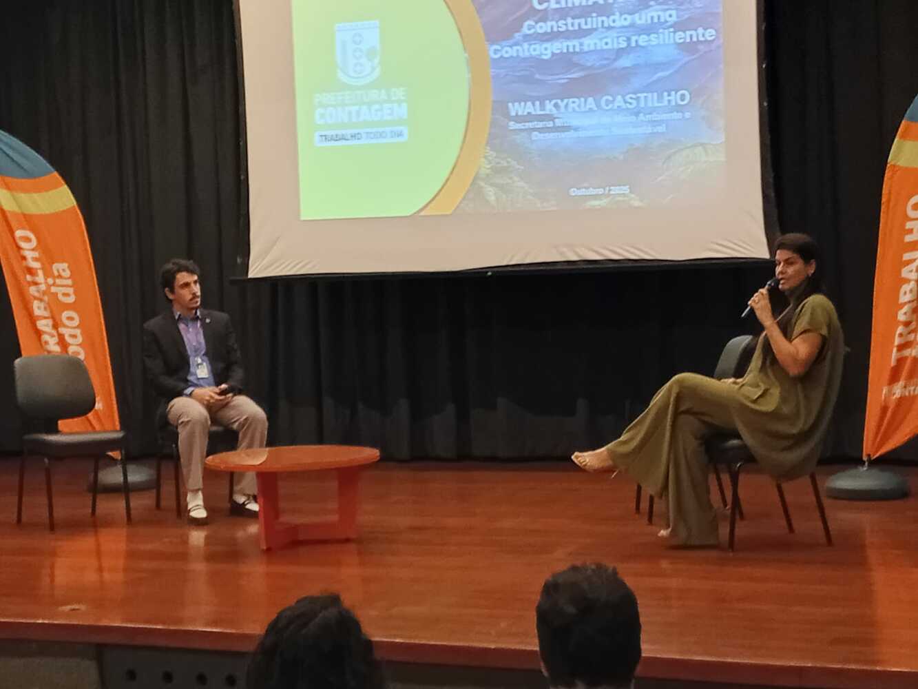 Em seguida teve início a palestra Diagnóstico e Inovação com o Diretor de Relações Internacionais e Atração de Investimento da SEDECON, Ademir Resende, e com a Assessora de Gabinete da SEMAD, Walkyria Castilho. Castilho apresentou o diagnóstico realizado para o Plano de Ação Climática de Contagem (PLAC), que objetiva definir as ações de resiliência e adaptação às mudanças climáticas a serem executadas pelo município nos próximos anos, visando ainda uma transição energética justa e eficiente. O diagnóstico foi apresentado por meio dos resultados iniciais do Inventário de Emissões de Gases de Efeito Estufa (GEE) e da Análise de Risco e Vulnerabilidade Climática (ARVC), etapas essenciais para a elaboração do PLAC. Através do PLAC, é intenção que poder público, setor produtivo, meio acadêmico e sociedade civil contribuam com ações que tornem Contagem um município que una inovação, eficiência e sustentabilidade produtiva, alinhadas à nova realidade climática global e local.